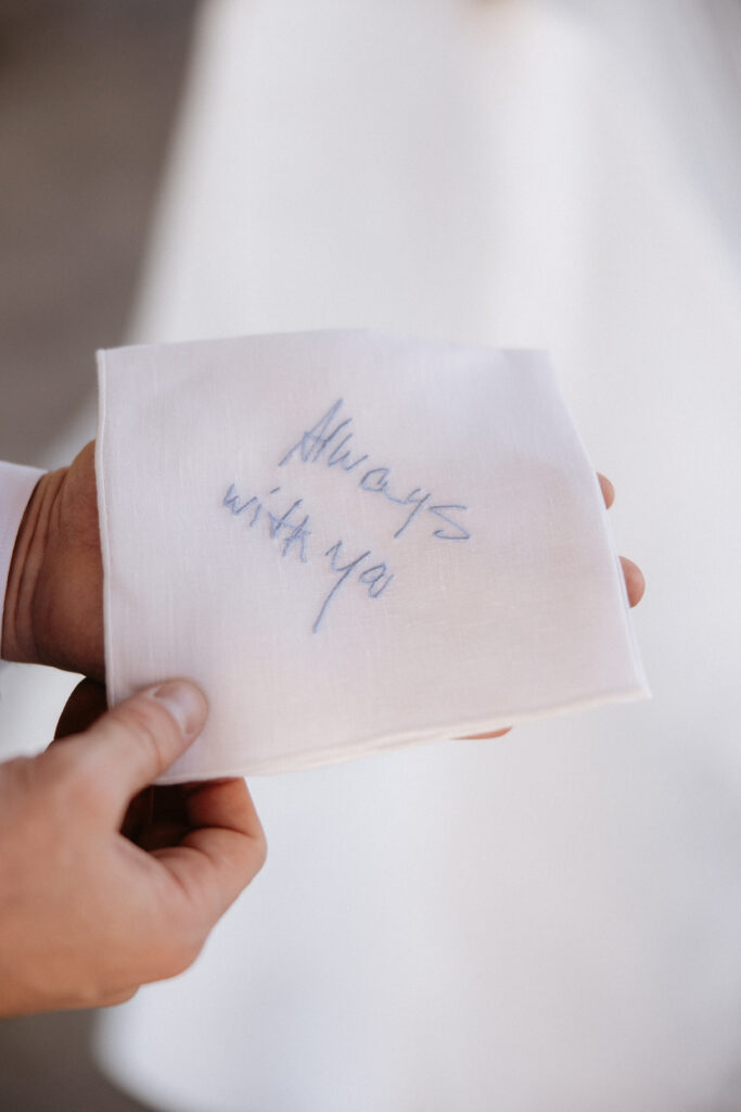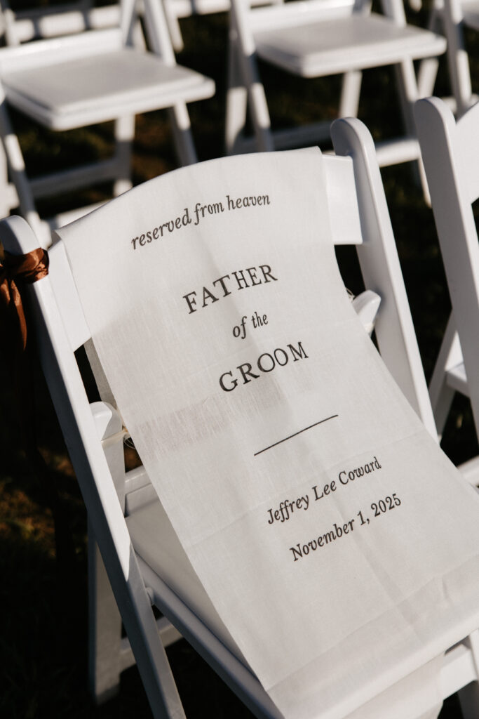Before guests even took their seats for the ceremony, they were greeted with a champagne welcome as the string trio played softly in the background. There was a chair in the front row draped with a sign that read reserved from heaven for Connor’s father, who wasn’t there in person but was so clearly present in every part of the day.