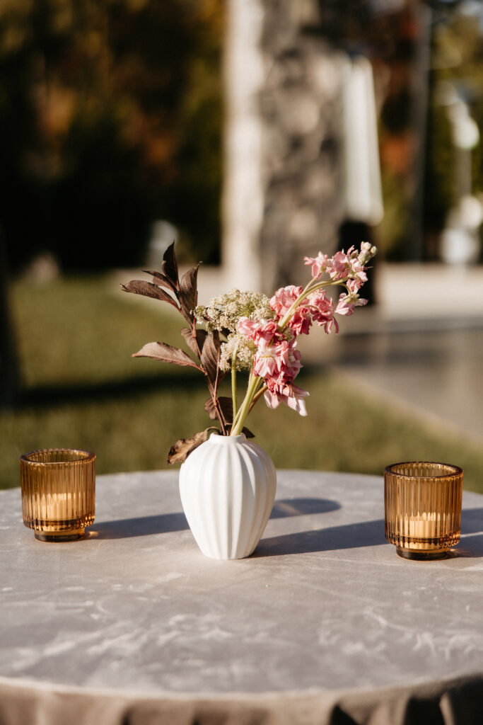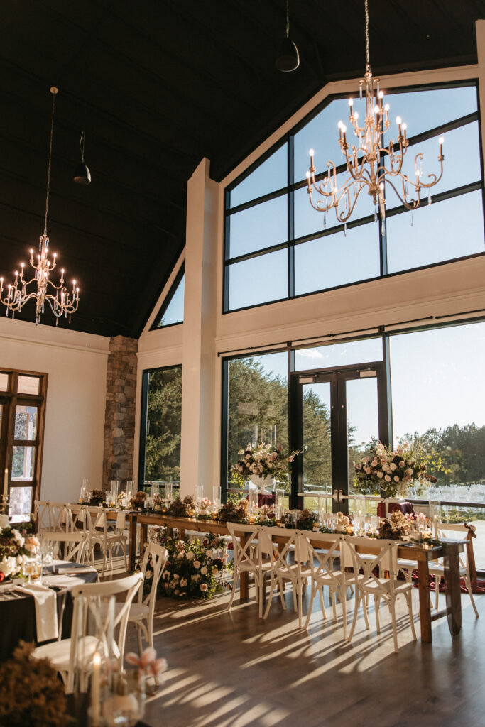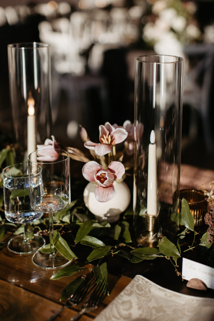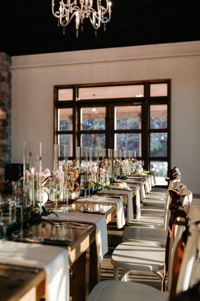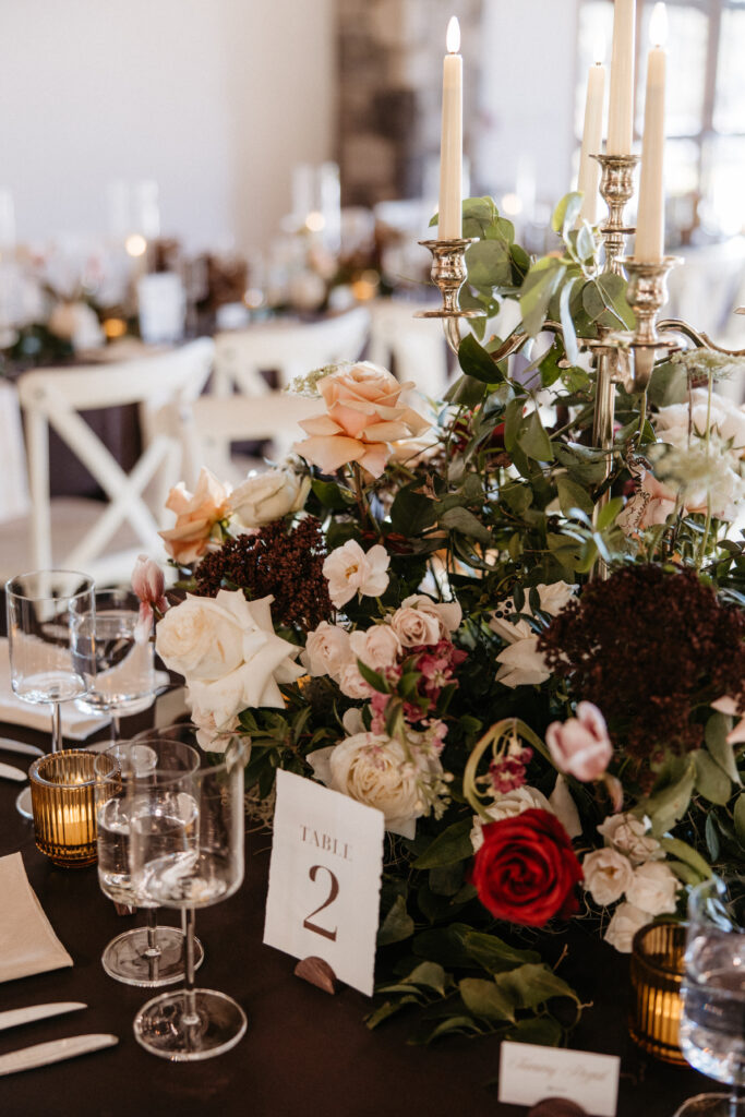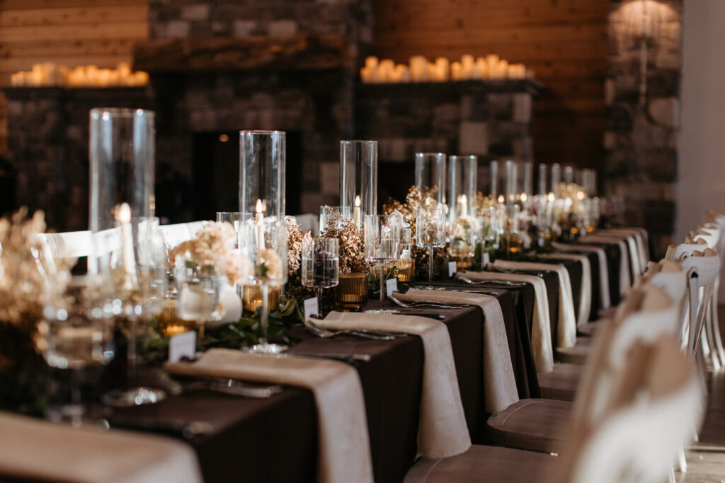 Inside, the reception carried that same energy into a different key. The long farm tables were dressed in dark chocolate satin with tone-on-tone damask napkins – textural and luxe. Organic florals spilled down the center of each table, winding between clusters of amber votives, brass candelabras, and tall sleek glassware. The glassware was a deliberate choice: something clean and modern to balance all that wildness and to mimic the hurricane glasses around the candles, and it worked beautifully. Every surface flickered. The fireplace was on. A trio of musicians – piano, saxophone, and guitar – played through dinner, and the whole room felt like it was wrapped in something warm and slightly enchanted.