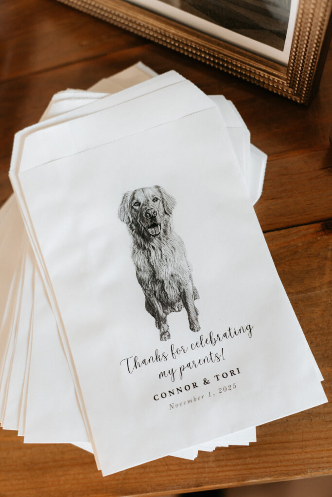 A seven-piece live band carried the night from there, and the dance floor never really emptied. Custom last name hats made an appearance, and Kevin, their beloved dog, was immortalized in fathead form and made his way around the room in the hands of various guests.