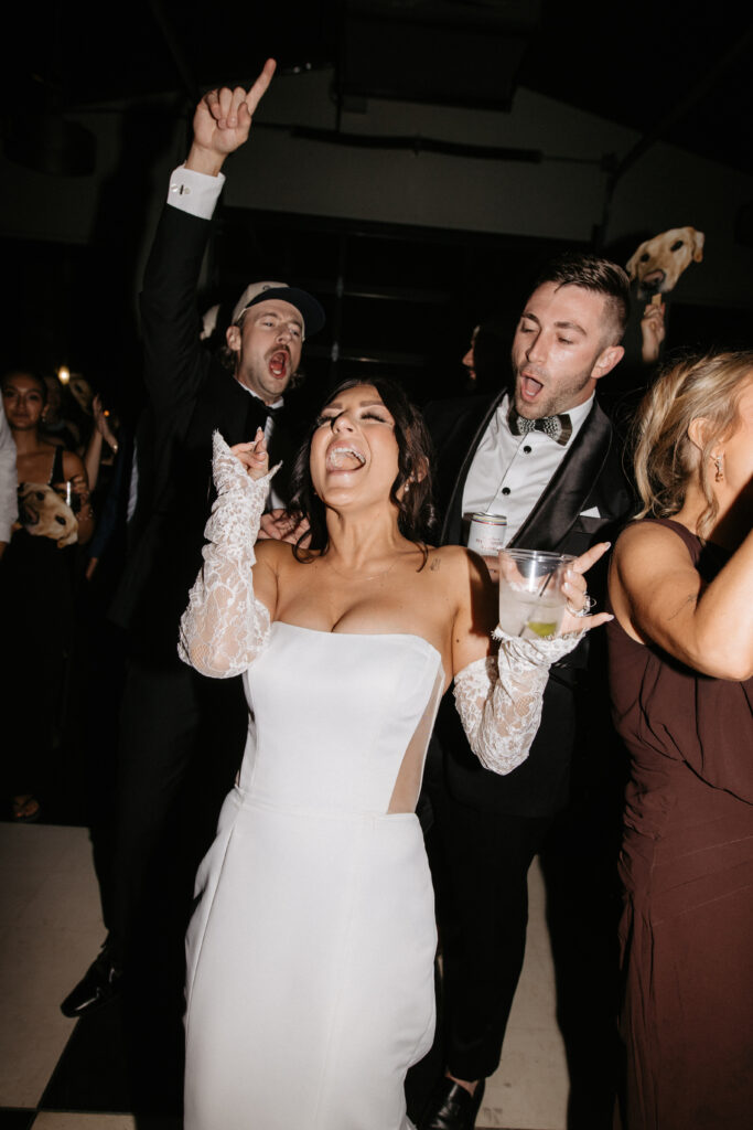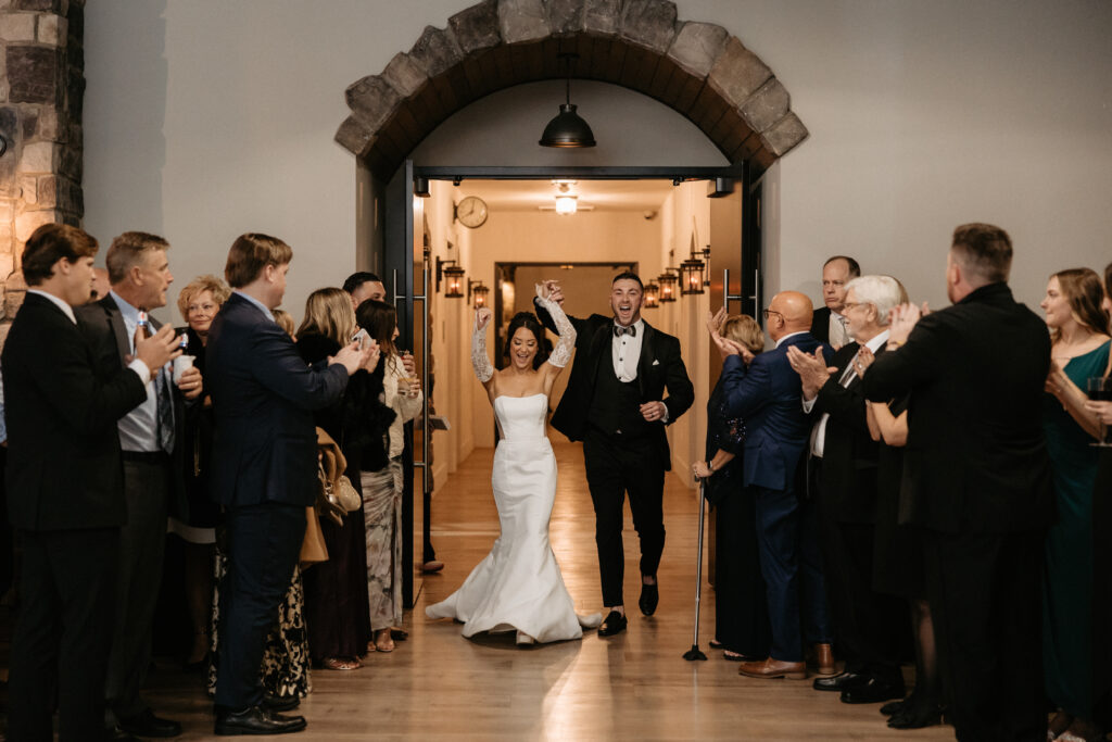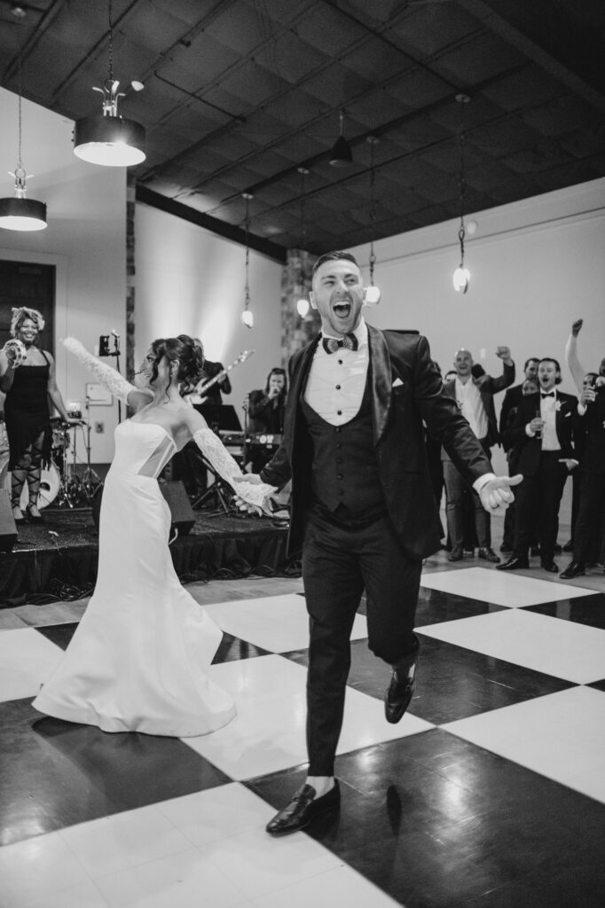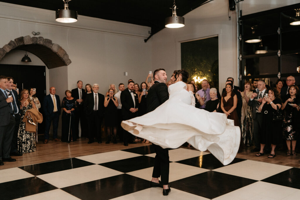 Tori and Connor’s grand entrance through DuGaren’s stone archway was pure energy. The room absolutely erupted around them. Their first dance was fully choreographed, and it brought the house down – Connor spinning Tori across the black-and-white checkered floor, her skirt flying. An incredible lift sent the crowd into full dynamite mode.