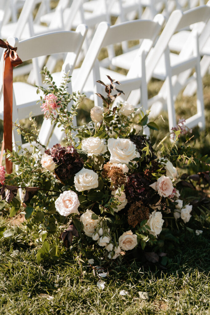 The ceremony set the tone right away. Two large urns flanked the end of the aisle, each overflowing with organic, loosely arranged blooms that looked genuinely foraged. Yards of wine-red velvet draped from the pedestals and pooled on the ground around them. Chocolate ribbon bows marked the chairs along the aisle. The whole scene had this romantic, almost otherworldly quality that felt completely intentional and completely Tori.