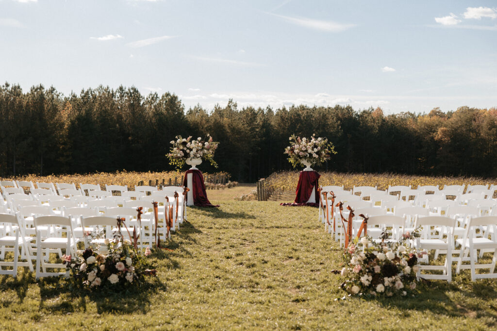Situated just outside Charlotte in Denver, NC, DuGaren Venues & Vineyards is the kind of venue that earns its keep before a single design element has even touched it. The property has this quiet, unhurried beauty to it: rolling vineyard rows and open sky that makes everything feel a little cinematic.